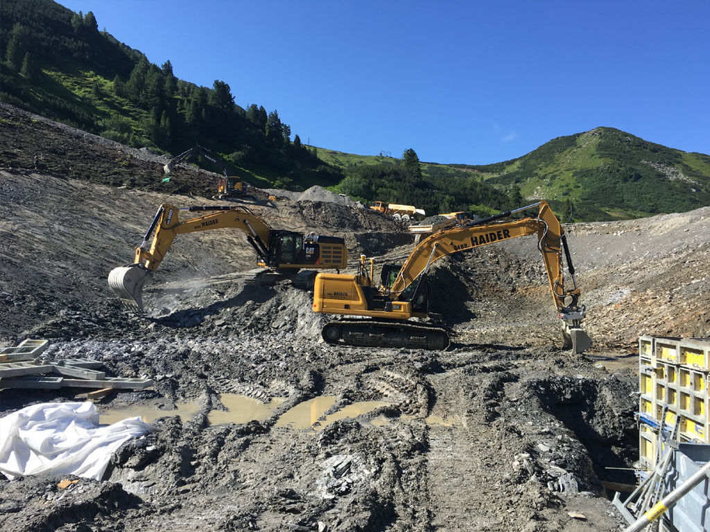 des Speichers Planneralm mit V- 50.000 m³. Die Bauarbeiten erfolgen grossteils durch GPS gesteuerte Baumaschinen der neuesten Generation wodurch eine effiziente Baudurchführung gewährleistet ist.